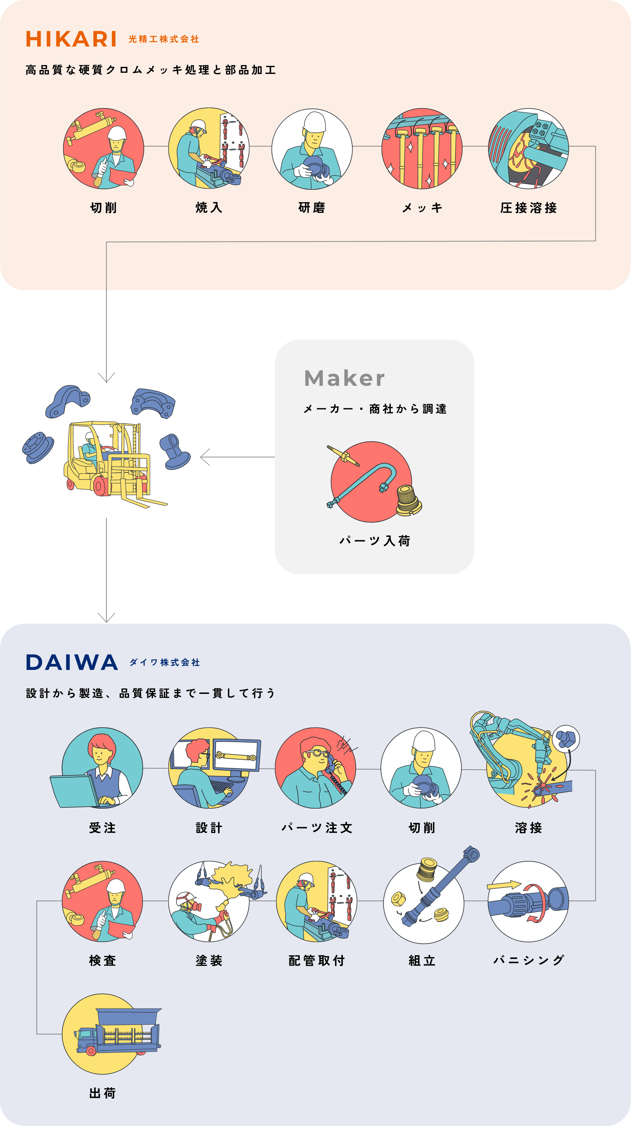 ダイワ・光精工は、建設機械に使われる油圧シリンダーを60年以上にわたり製造してきました。この長い歴史を支えてきたのは、技術力だけではなく「人の力」です。
